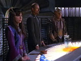 "There comes a moment in everyone's life," Sheridan tells the Alliance Council, "when you have to do something you would rather not do. When you know something you would rather not know. This is one such moment." Having promised to come forward with any conclusive evidence he finds, Sheridan is now ready to reveal to the Council the evidence that indicates the Centauri Republic is behind the attacks on Alliance shipping lines.